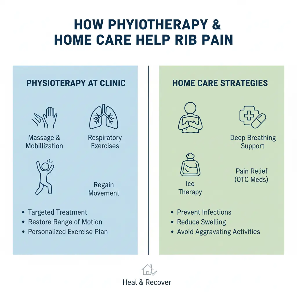 The most effective approach pairs accurate diagnosis with targeted physiotherapy, including manual therapy, mobility work, breathing exercises, and home rehab. This restores rib function, reduces inflammation, and supports long-term recovery for left or right rib pain.