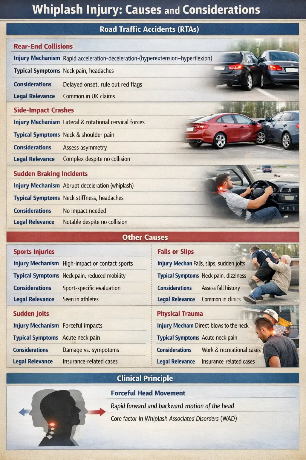 | Road Traffic Accidents (RTAs) | Rear-end collisions | Rapid acceleration–deceleration causing cervical hyperextension followed by hyperflexion | Neck pain, stiffness, headaches, upper back pain | Symptoms may be delayed; imaging is usually not required unless red flags are present | The most common cause of such trauma in UK RTAs is frequently cited in medico-legal claims |